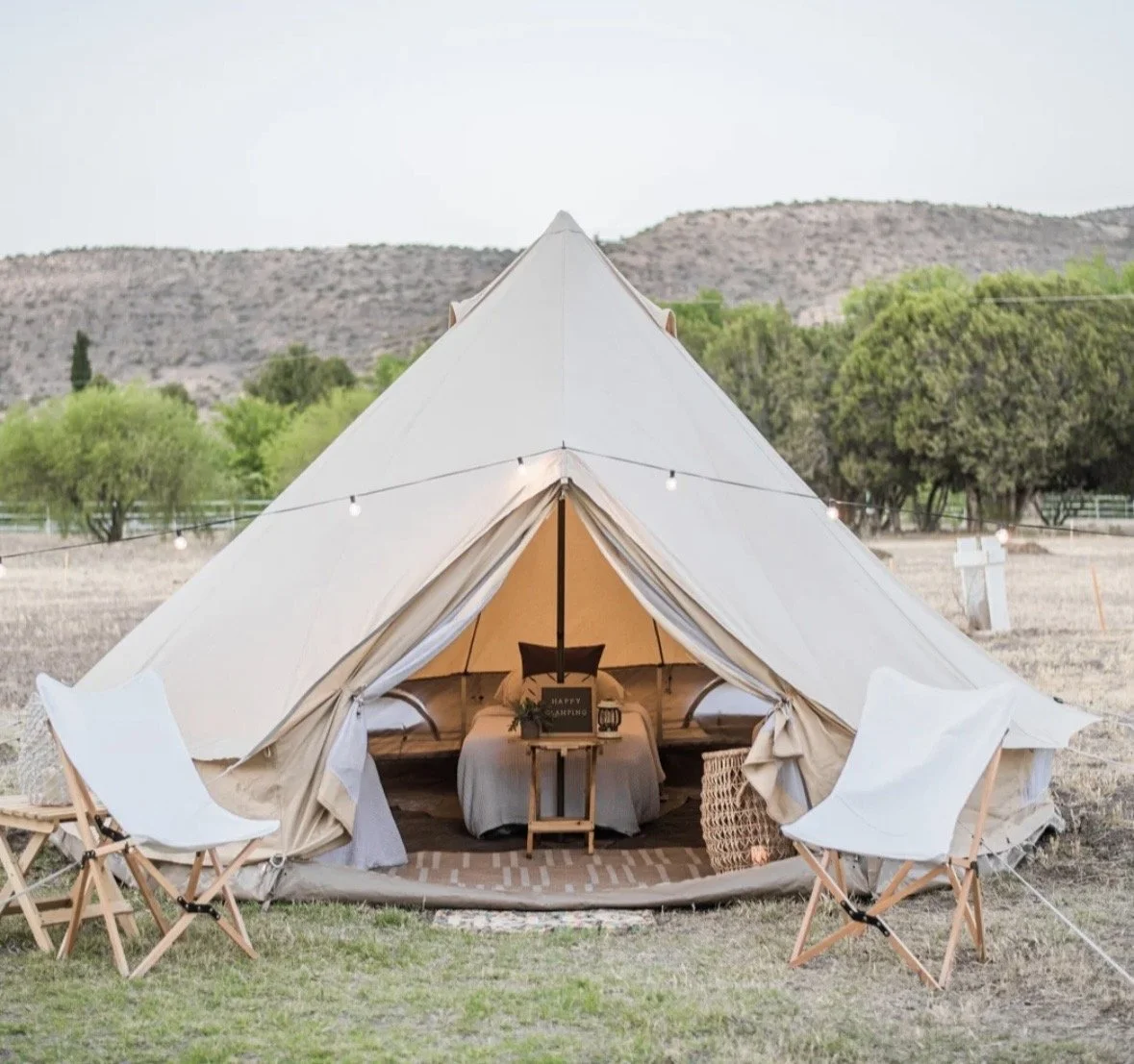 All glamping rentals include linens, a duvet blanket, pillows, rugs, lanterns, bedside tables and portable phone chargers.